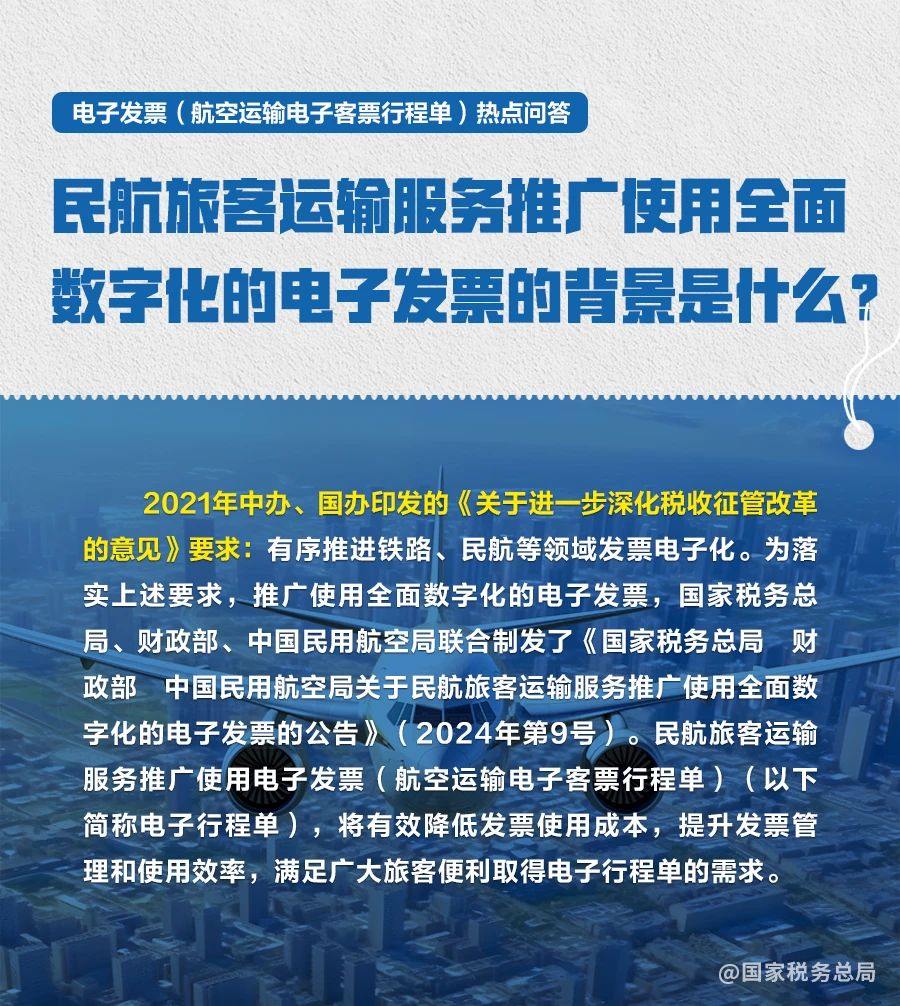 日前,國家稅務(wù)總局、財(cái)政部、中國民用航空局聯(lián)合發(fā)布《關(guān)于民航旅客運(yùn)輸服務(wù)推廣使用全面數(shù)字化的電子發(fā)票的公告》,明確自2024年12月1日起,在我國民航旅客運(yùn)輸服務(wù)領(lǐng)域推廣使用全面數(shù)字化的電子發(fā)票——電子發(fā)票(航空運(yùn)輸電子客票行程單)。相關(guān)熱點(diǎn)問答如下: