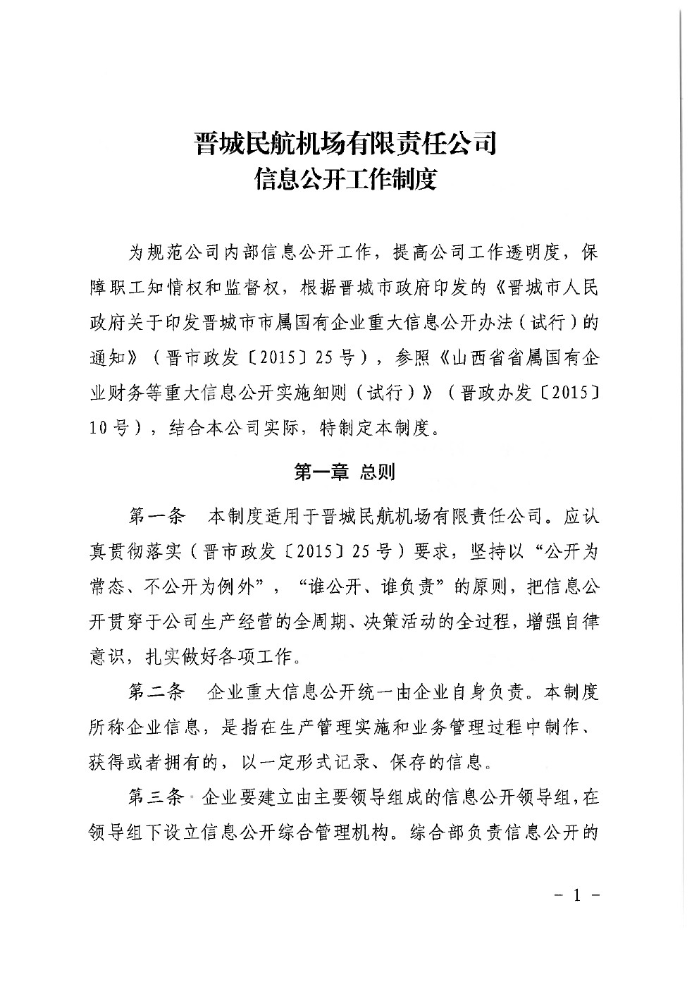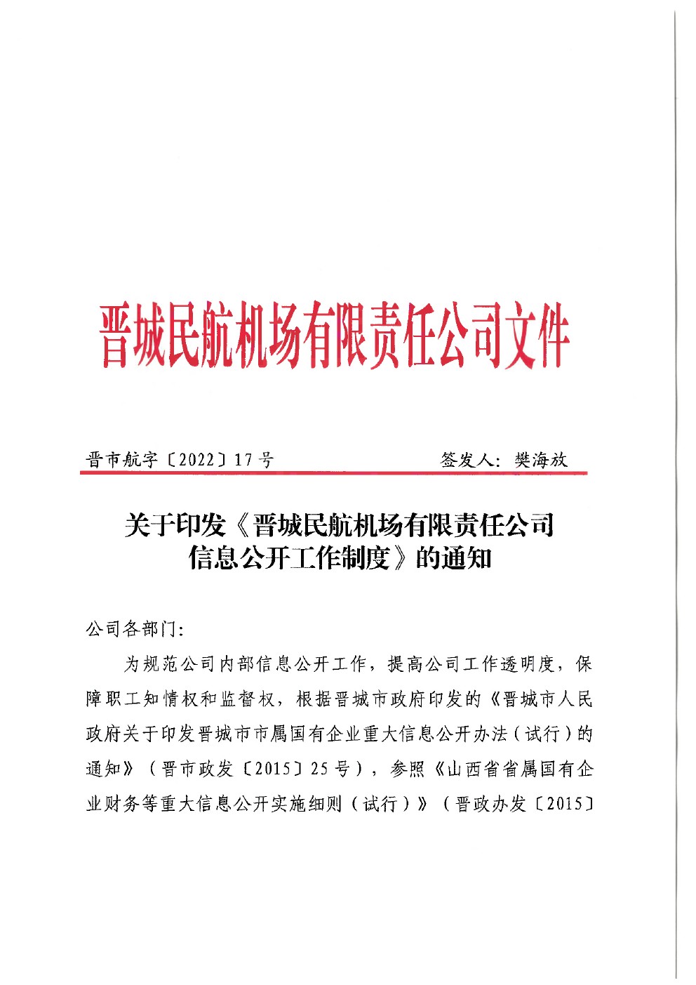 關(guān)于印發(fā)《晉城民航機場有限責(zé)任公司信息公開工作制度》的通知