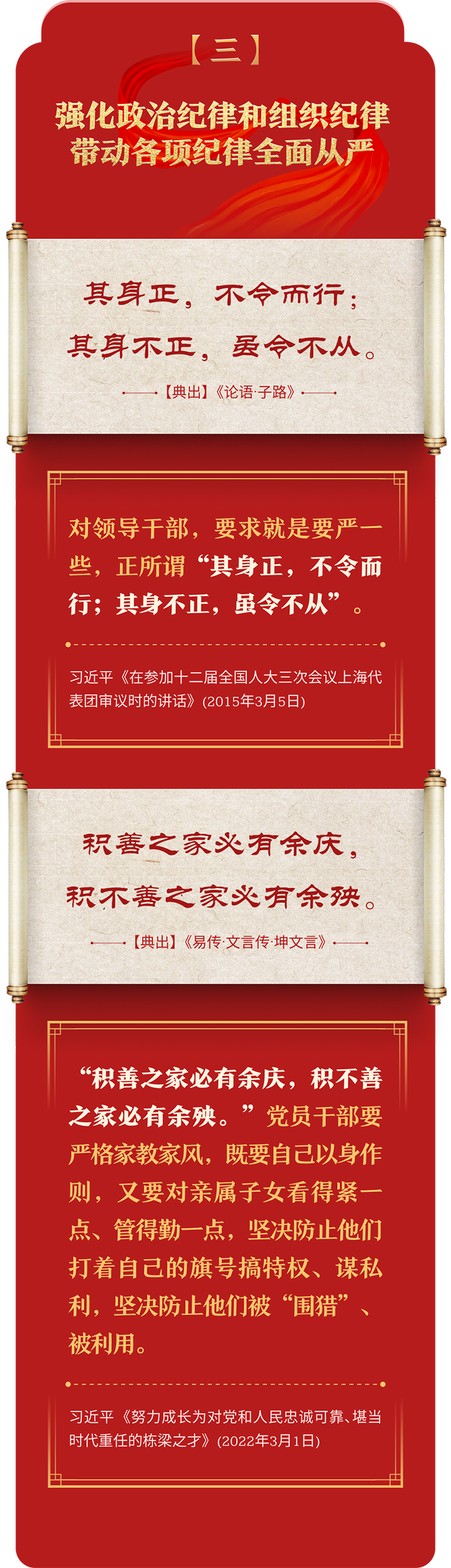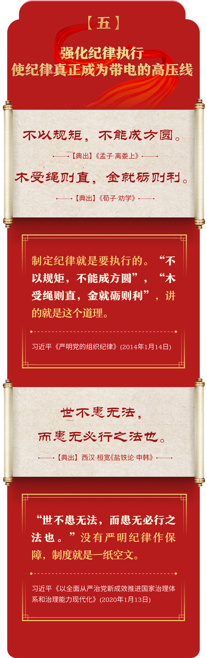 編者按:加強紀律建設是全面從嚴治黨的治本之策。黨的十八大以來,習近平總書記圍繞全面加強黨的紀律建設發表一系列重要論述,立意高遠,內涵豐富,思想深刻,引導黨員干部學紀、知紀、明紀、守紀,真正把紀律規矩轉化為政治自覺、思想自覺、行動自覺,確保全黨目標一致、團結一致、步調一致。在這些重要論述中,總書記精妙運用古代典籍經典名句,以古喻今、啟迪思想、激蕩精神,讓我們一起來學習!