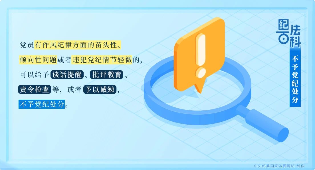 《中國共產黨紀律處分條例》第十九條第二款規定:黨員有作風紀律方面的苗頭性、傾向性問題或者違犯黨紀情節輕微的,可以給予談話提醒、批評教育、責令檢查等,或者予以誡勉,不予黨紀處分。
