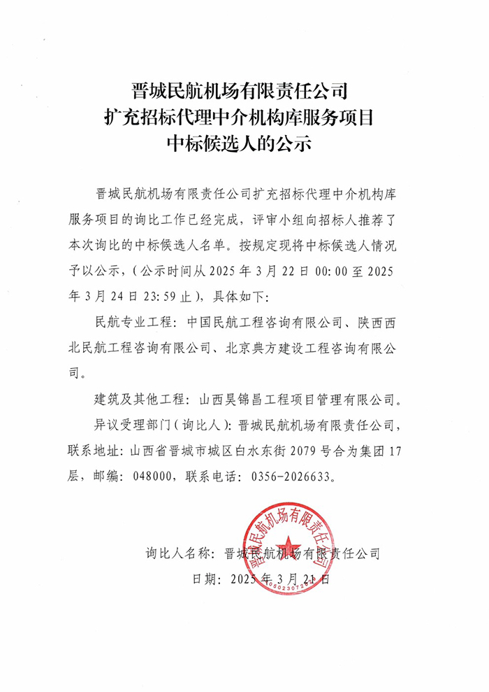 晉城民航機(jī)場有限責(zé)任公司擴(kuò)充招標(biāo)代理中介機(jī)構(gòu)庫服務(wù)項(xiàng)目中標(biāo)候選人的公示
