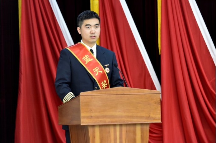 藍(lán)天獎(jiǎng)?wù)芦@得者、國(guó)航飛行總隊(duì)三大隊(duì)一中隊(duì)中隊(duì)長(zhǎng)王雨寒宣讀倡議書(shū)